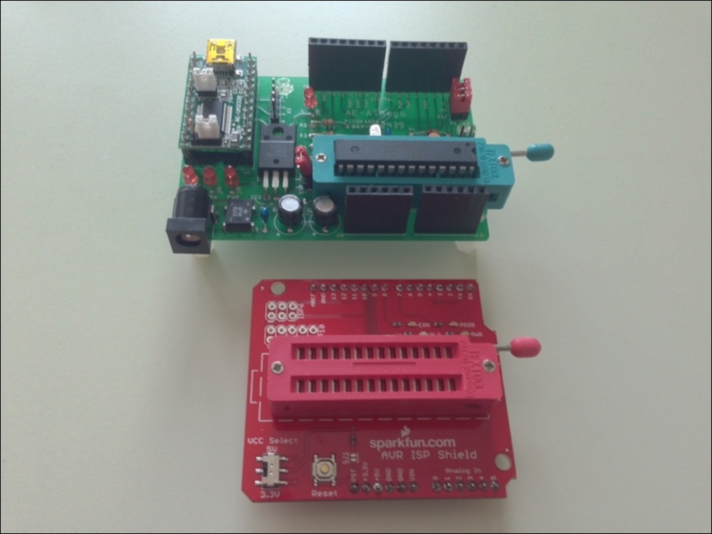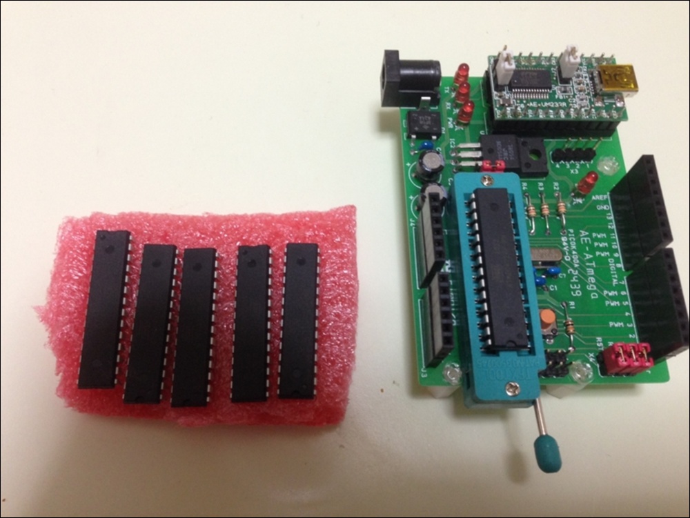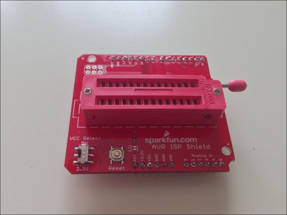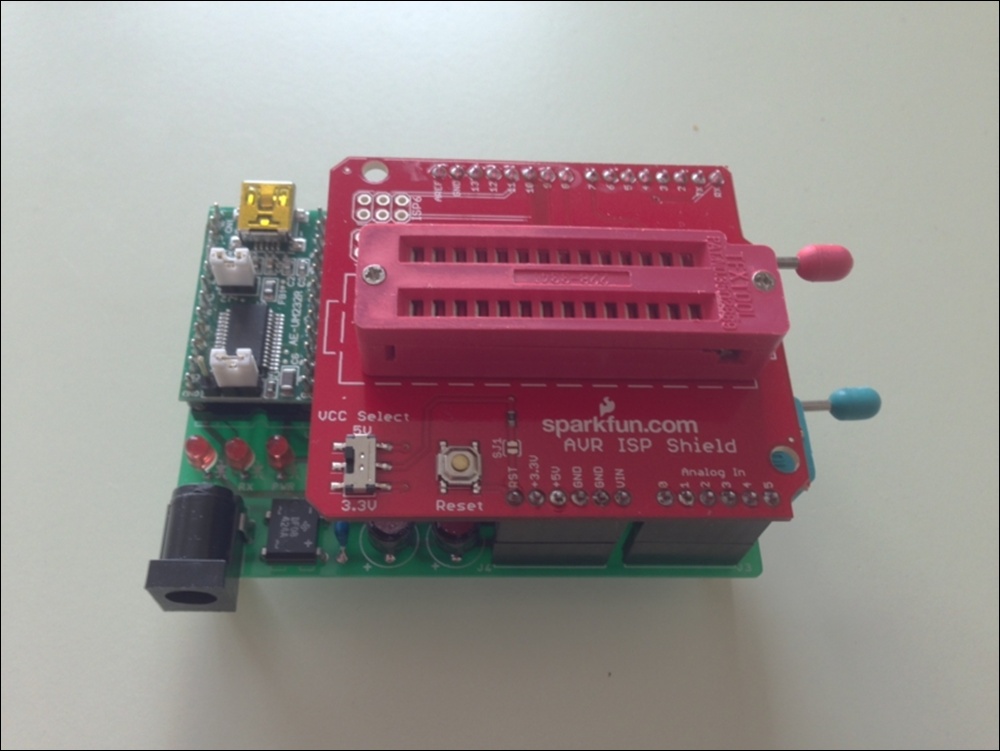 私は、ゼロプレッシャー IC ソケットを使った Arduino Uno 互換機を作って、これに AVR ISP シールドキットを装着し ATmega328 のスケッチ書込み専用機として使っています。
