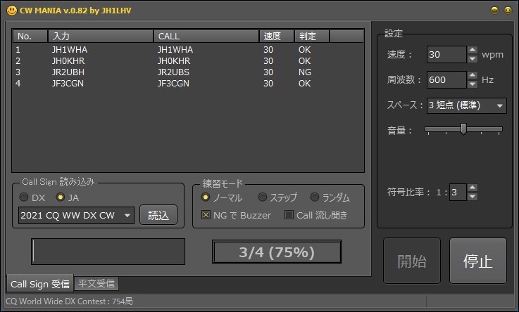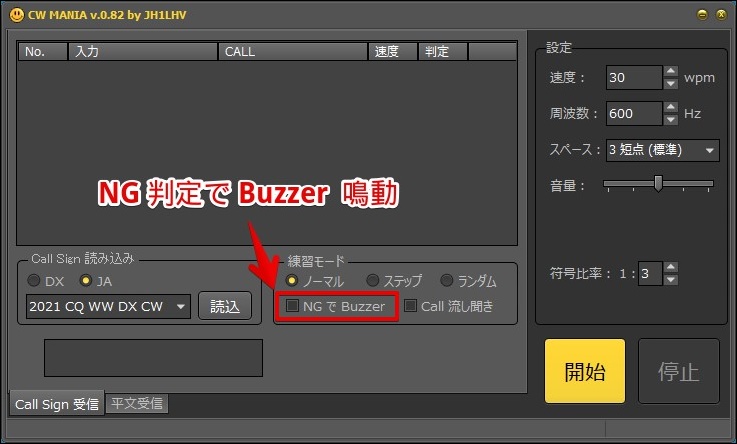 ”NG で Buzzer” のチェックで、コールサインの聞き取りに間違い(キーボード入力間違いを含む)があれば、300Hz の短い音が1回だけ鳴動します。(正解時はこれまでと同じで音なしのスルー)
