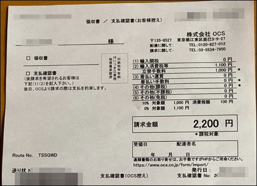 配送指定は OCS で、国内では佐川急便が届けてくれたんですが、「入関税・消費税手数料(立替手数料)」ということで、荷物受取の際に 2,200円 が請求されました。
