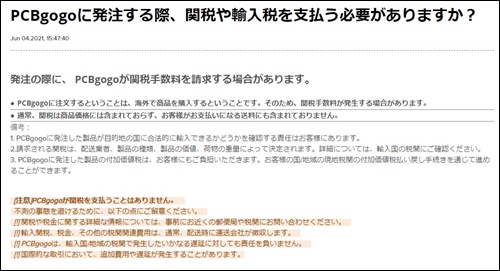 確かに、PCBGOGO の Q&A に、「・・・関税手数料が発生する場合があります。」とありました。